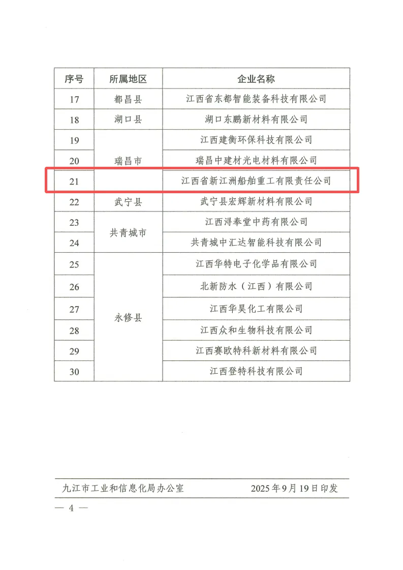 近日,九江市工業和信息化局、九江市財政局、國家稅務總局九江市稅務局聯合印發《關于公布2025年(第15批)九江市市級企業技術中心名單的通知》(九工信字〔2025〕81號),歷經企業自主申請、主管部門審核推薦、答辯評審、現場核查、社會公示等多環節層層篩選,新江洲船舶重工技術中心憑借在船舶制造領域的技術積累、研發投入力度及成果轉化能力,最終通過認定,成為瑞昌市此次入選名單中的重要一員,標志著公司技術創新能力與研發體系建設獲市級主管部門正式認可。